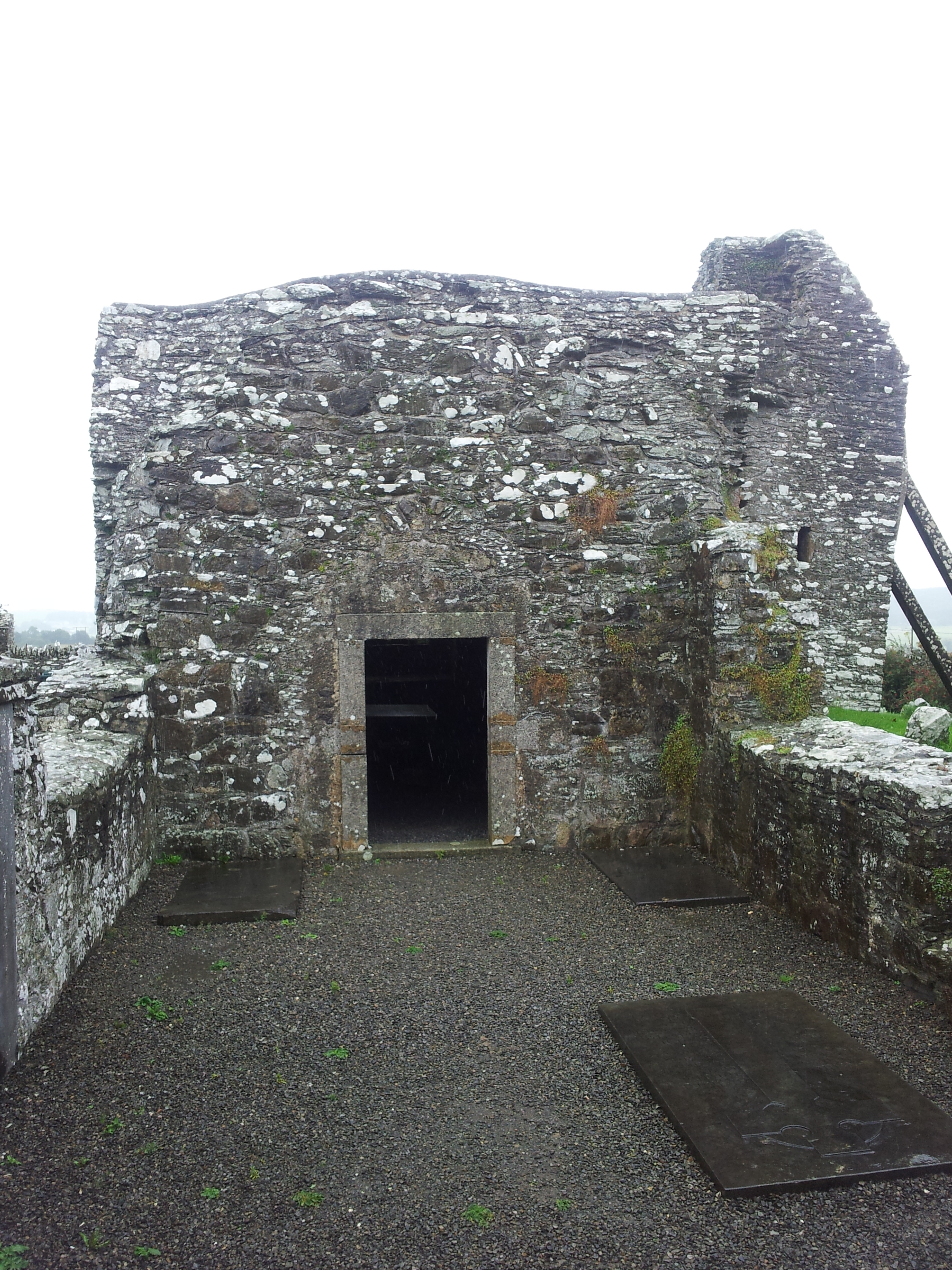 An absolute downpour greeted me as I arrived at this site, but the misty early afternoon light added to the rain and gave the perfect backdrop to this beautiful place.The walkway up to the site would kick even the most soggy heart into life as the tower and church come into view through the trees. This beautifully preserved site was originally founded by St Bridget circa 605 AD(not the more well known Kildare Town related Saint) and named Oughterard (in Irish Uachtar Ard) which translates as ‘A High Place’ . The round tower which stands around 9.5 metres in height dates from approximately the 8th century and is the only remnant of the original monastery/convent. The round tower and monastery were destroyed in 995AD by Vikings led by Sigtrygg Silkbeard. The church on the grounds has recently been dated to around 1350 AD and truly is a sight to behold. Half of the building is collapsed but the rest is still roofed and a large stairway leads up to the top of the building. The stairway is actually coming away from the main building but has been supported with buttresses, its amazing the slippy, slanted stairs haven’t been blocked off yet. Writings suggest that the chapel ceased to be in use by 1620 but it is hard to ascertain if it was used after this time as some of the burials on the site suggest so. I didn’t know until after visiting that Arthur Guinness is apparently buried here (his grave is in the chapel), also in an adjoining field Daniel O’ Connell took part in a pistol duel! He was challenged to the duel by a John D’Esterre on February 1st 1815, D’Eseterre was an ardent conservative and was angered when O’ Connell critcised a Dublin Corporation provision for the poor as ‘beggardly’. D’Esterre died from his wounds sustained in the duel.