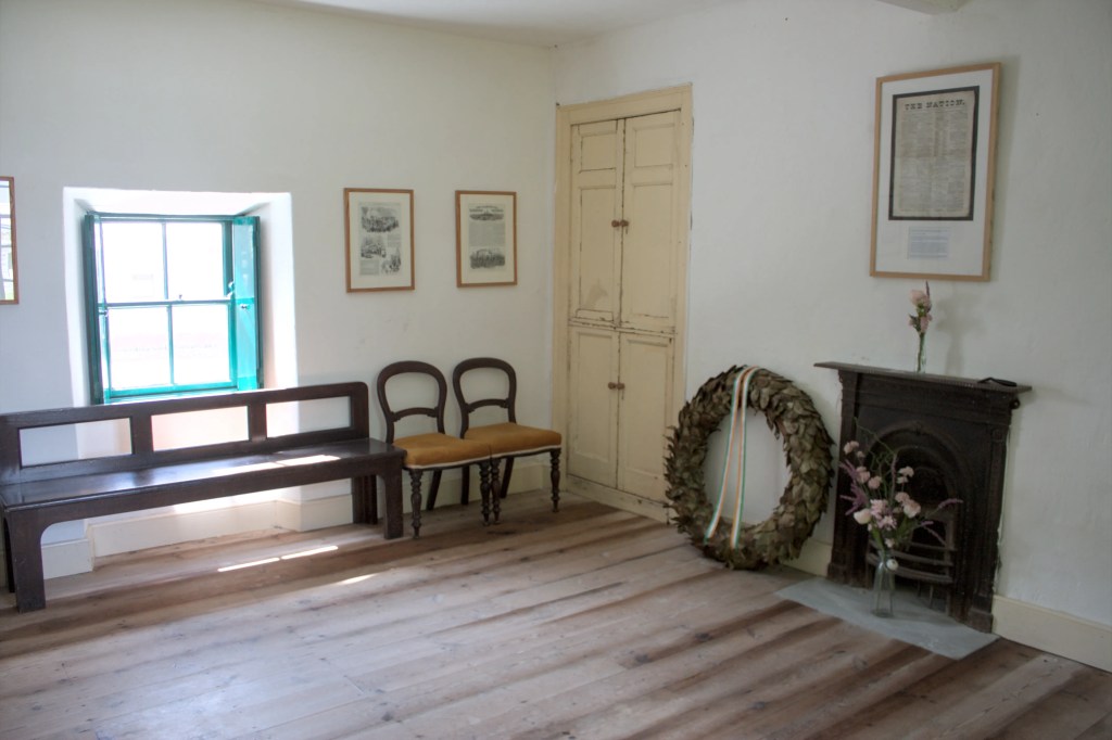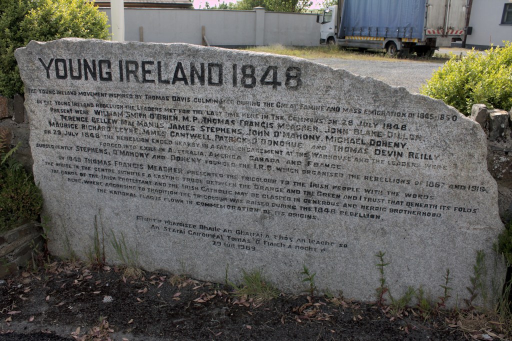 The Famine Warhouse 1848, also known locally as Ballingarry Warhouse or the Widow McCormack’s House stands on a high point of the Slieveardagh Hills overlooking a small village known as The Commons. It was the site of a skirmish in the Young Irelander Rebellion of 1848 and one of the earliest times the Irish Tricolour was flown. The Young Irelanders were influenced by the multidenominational nature of the United Irishmen and Wolfe Tone of the 1790s. They demanded an Irish Parliament and did not rule out the use of force if necessary. The leading newspaper of the 1840s and an exponent of the Young Irelander’s vision was ‘the Nation’, it had been founded by two Catholics and one Protestant, again showing the multidenominational nature of Irish Nationalism throughout the 18th and 19th centuries. The three men who established the paper were Charles Gavin Duffy, Thomas Davis and John Blake Dillon. In 1848 the leader of the Young Irelanders was William Smith O’Brien, an Irish protestant aristocrat and MP for County Limerick. The Young Irelanders had become increasingly radicalised by what they witnessed during the Famine and were inspired by the revolutions that began to sweep across Europe in 1848. Revolutions had broken out in many prominent European cities such as Berlin, Prague and Rome, and in February the King of France was overthrown and a republic was declared. William Smith O’Brien and another leader of the Young Irelanders Thomas Francis Meagher led a delegation to Paris to congratulate the revolution and establishment of the republic in France and returned to Ireland with the tricolour flag (now Irelands national flag) which epitomised the joining together of orange (protestant) and green (catholic) in peace and hope of the establishment of an Irish State.