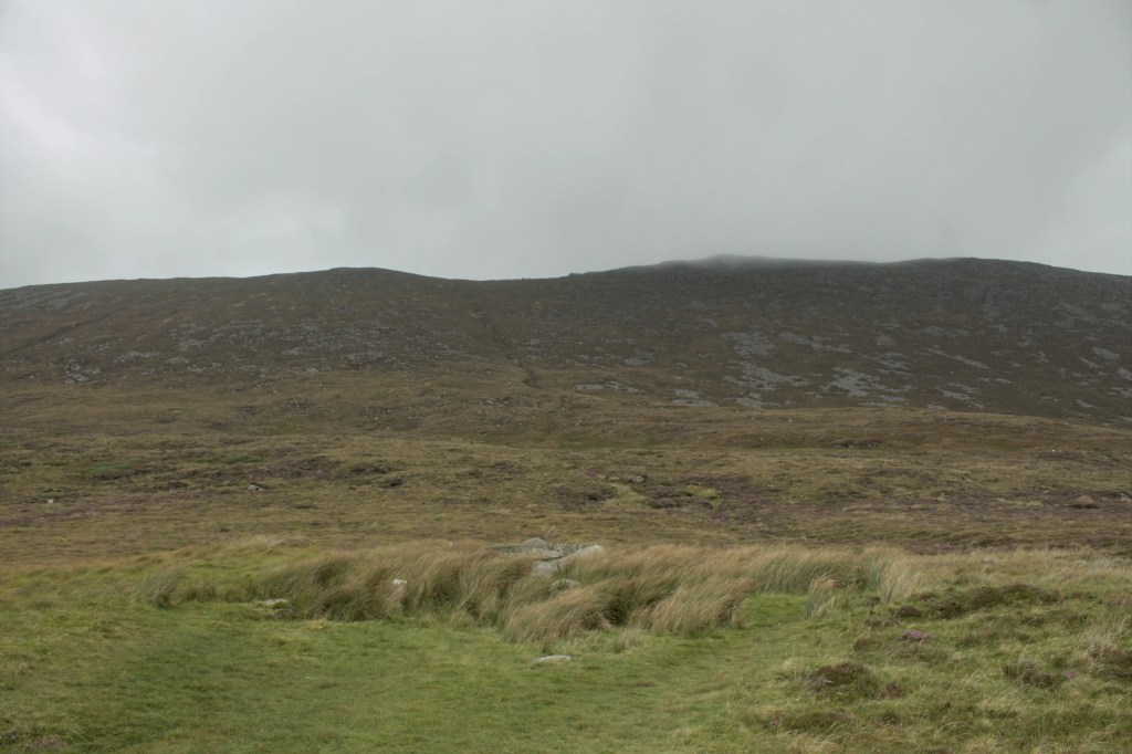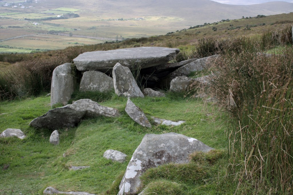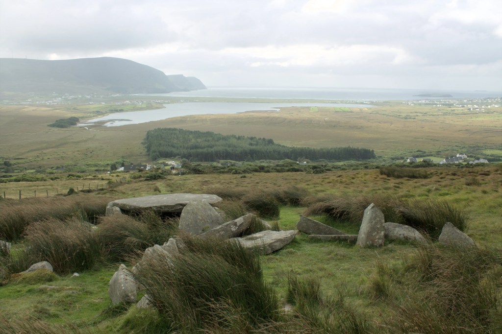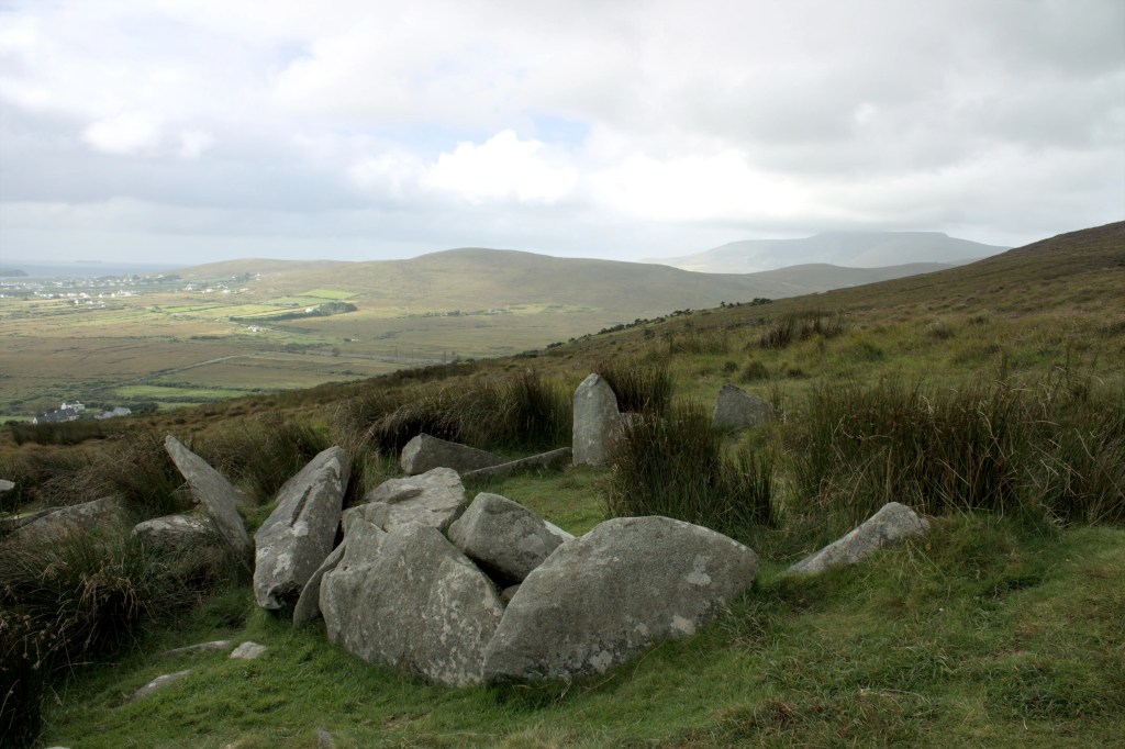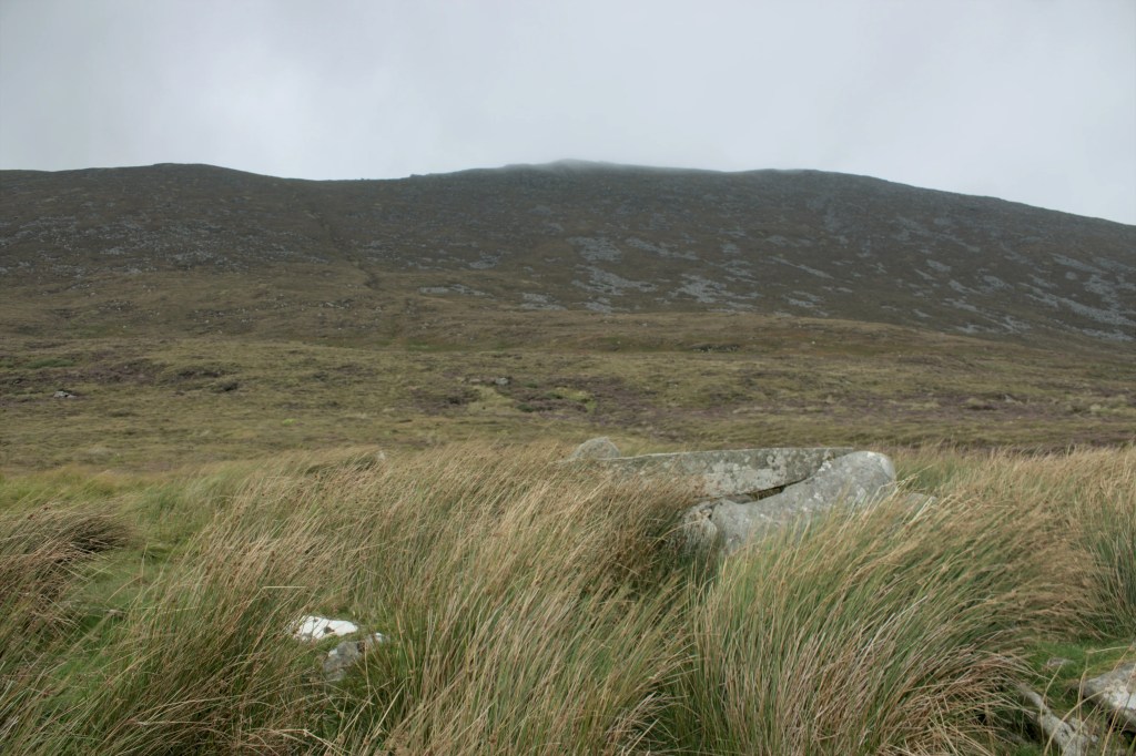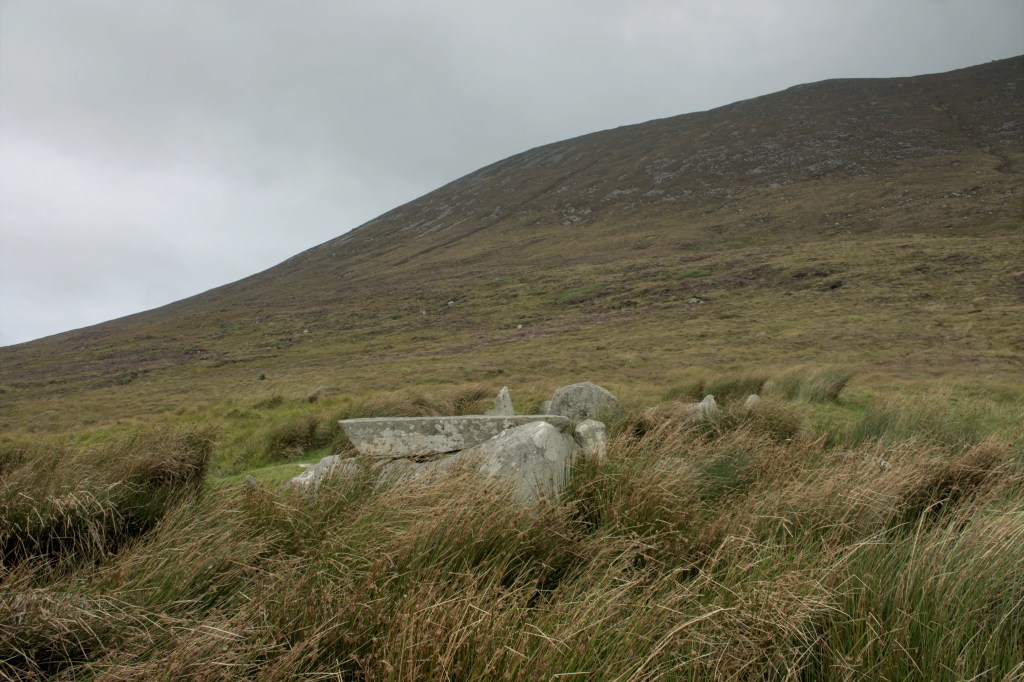 Keel East Court Tomb sits on the lower slopes of Slievemore Mountain on Achill Island in County Mayo. The tomb is aligned North-South with the court opening facing towards the mountain, and with beautiful views down past the tomb to the cliffs of Minaun and the ocean. There has been some collapse and possible removal of stones that make it hard to ascertain whether there were two or three chambers originally in the monument however the court and the rear chamber are in good condition. There is a stone at the entrance to the chamber which may have originally been the lintel stone. Thankfully the large roof stone on the rear chamber gives the structure a recognisable shape and form. This area has quite a few other megalithic monuments and there is meant to be another court tomb nearby however the day of our visit was the type of wet and cold only the Atlantic coast can muster so we didn’t search for too long! The Irish language scholar John O’Donovan visited Keel East in 1838 and in his Ordnance Survey letters made mention of the tomb having being larger in the recent past, he recounted the story of a miller from the area who took a stone from the tomb to use as a millstone, however the stone didn’t end up suitable and was discarded, like in many of these tales the miller died within the year!